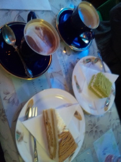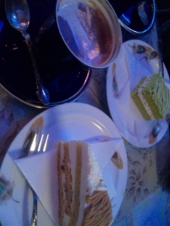 暖かいココアとマロンケーキ、暖かいカフェオレと抹茶ケーキ。