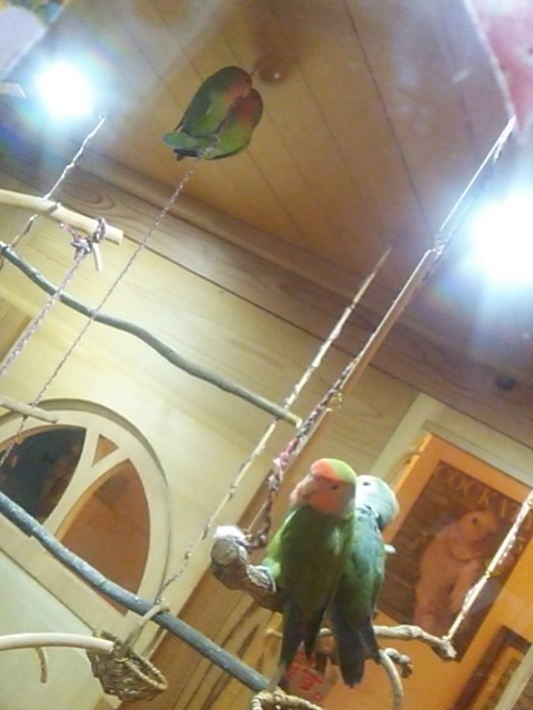 お店の顔コザクラインコちゃん4羽、勢揃いで仲睦まじくペアを作ってました。