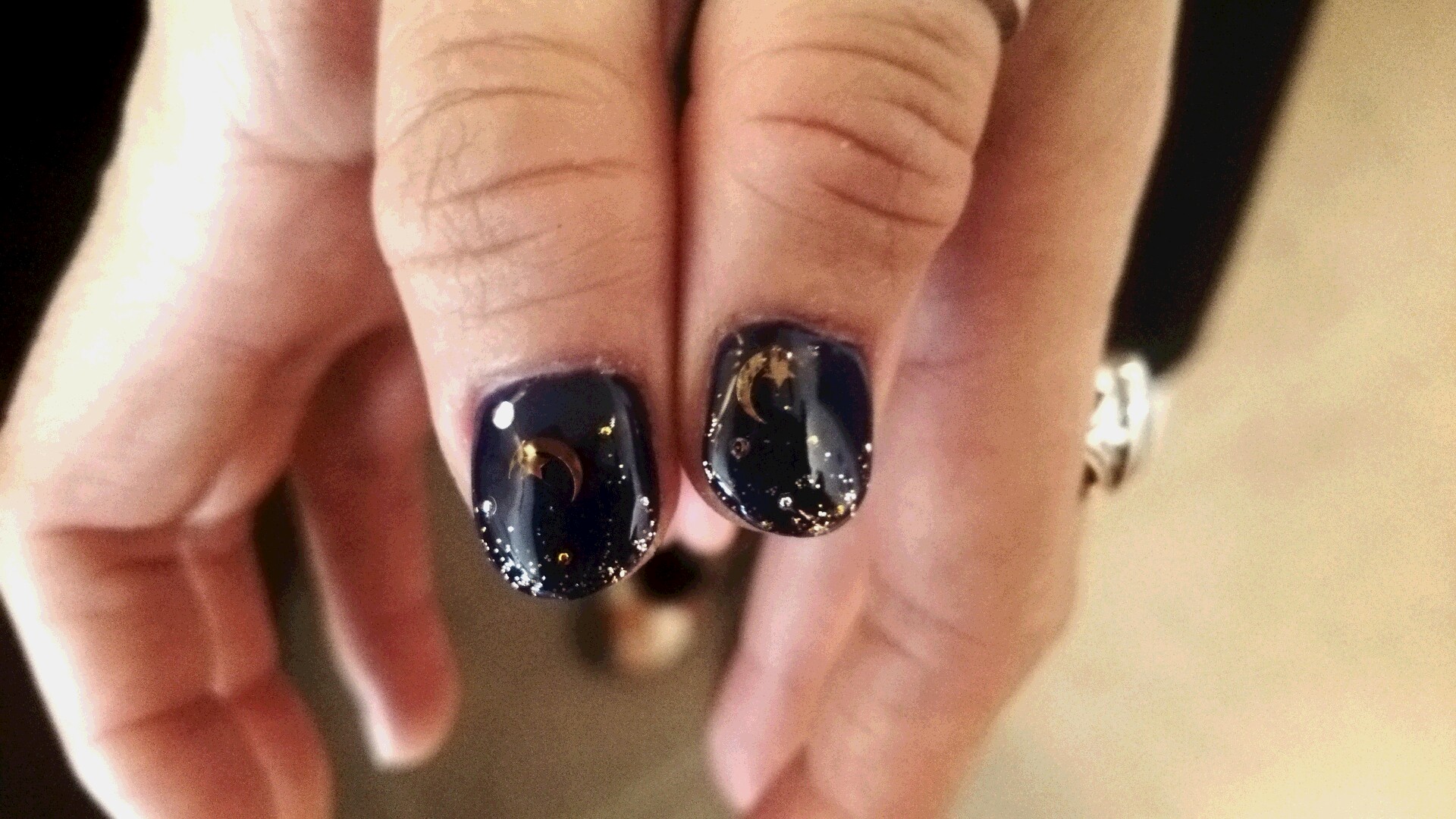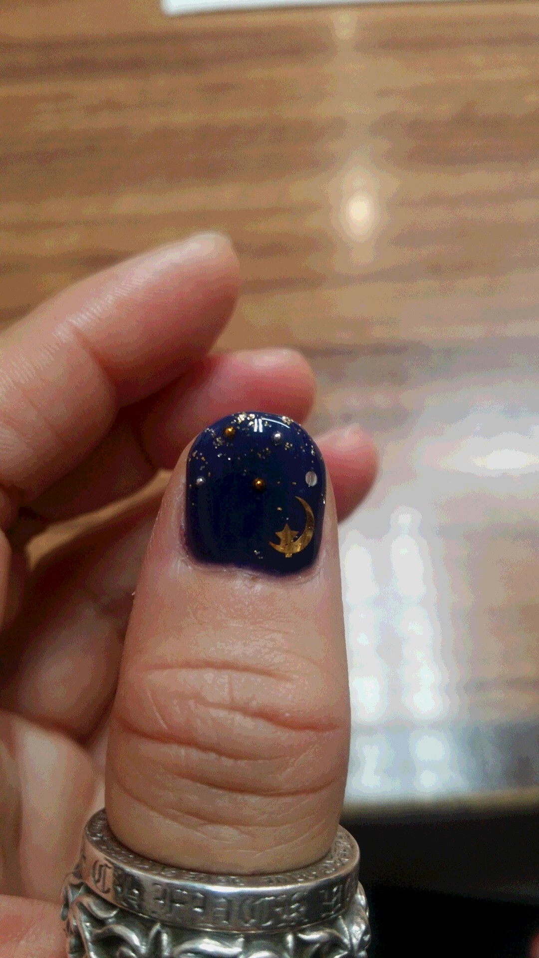 紫の強い青色に、月と星のパーツに小さなスワロと金銀の粒を散らして☆