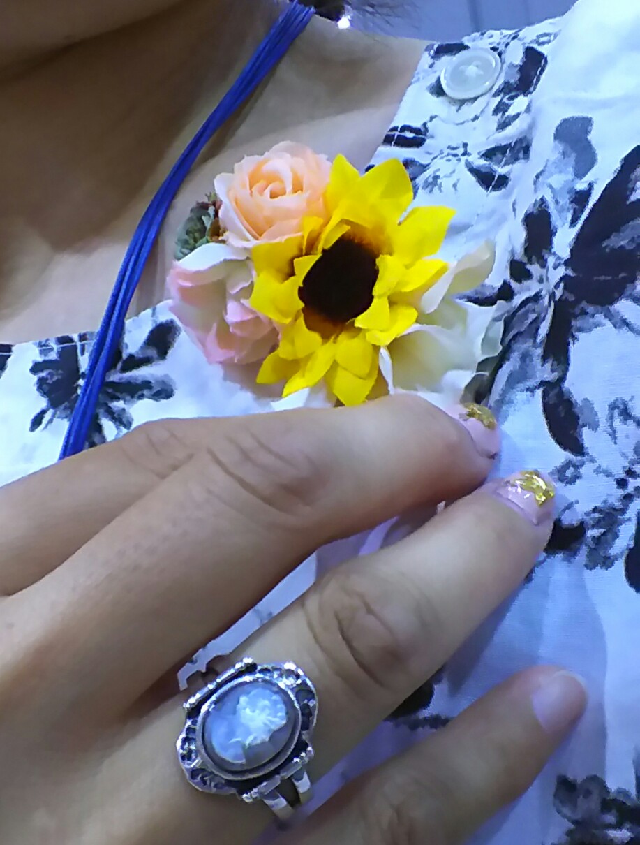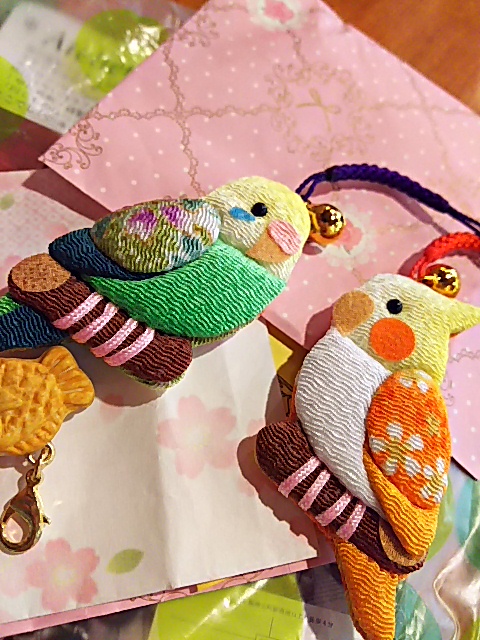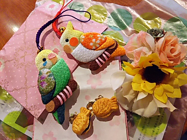 このちりめんで出来た鳥さん、一目惚れして連れて帰ってきました。また、ヒマワリのクリップピンは帰るまでの間、私のブラウスの襟元に花を添えてくれていました。