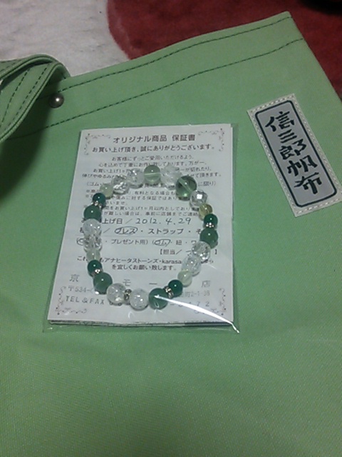 昨日、京都の帆布やさんで買ったカバンと、天然石のブレスレットを修理してもらってるときに、一目惚れしたブレスレット。